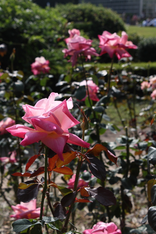 神代植物公園で10/23に撮影しました。逆光で撮影したピンクのバラ、たくさん咲いている神代植物園らしいカットと思いました。