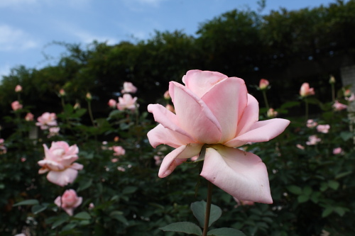 秋バラを神代植物公園で10月23日に撮影しました。ピンク色のバラを青空の下で撮影しました。