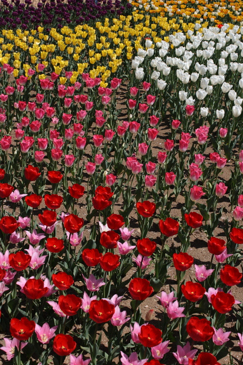 2011年4月17日に撮影した黄色とピンクと白と赤と紫のチューリップです。撮影場所は、昭和記念公園です。コメントいただけるととても喜びます。よろしくお願いします。